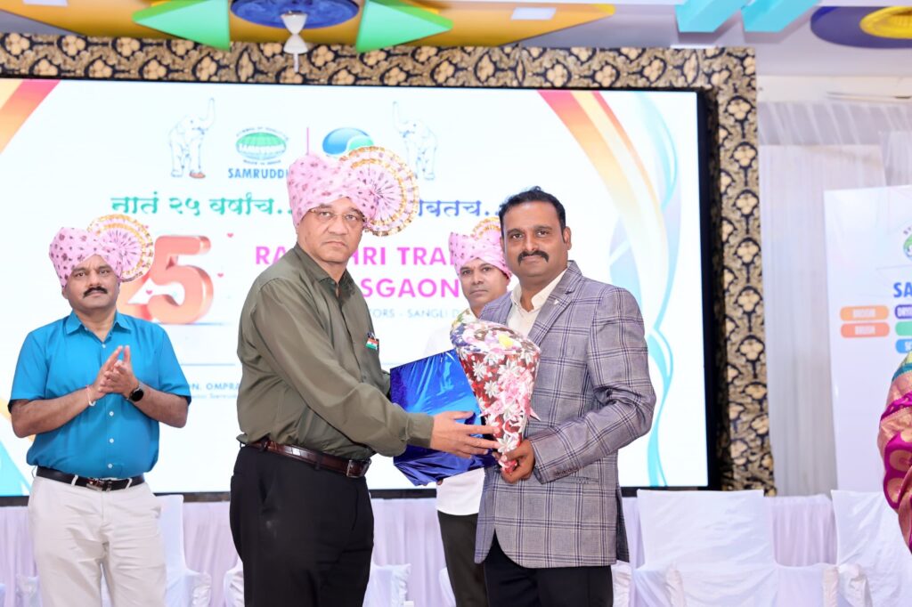 गुरुवार, दिनांक – 11 सप्टेंबर 2025, तासगाव (महाराष्ट्र मराठी न्यूज वृत्तसेवा) – जिद्द व अखंडित कष्टातून राजश्री ट्रेडिंग कंपनी सर्वसामान्यापासून धनदांडग्यापर्यंत पोहचली, अविरत सेवेतून राजश्री ट्रेडींग कंपनी मोठ्या प्रमाणात लोकांच्या पसंतीला उतरली, असे गौरवउद्गार समृद्धी उद्योग समूहाचे संस्थापक रमाकांत मालू यांनी काढले. मंगळवारी (दि.९) समृद्धी मल्टीपर्पज हॉल, तासगाव येथे राजश्री ट्रेडिंग कंपनीच्या रौप्य महोत्सव कार्यक्रम प्रसंगी ते बोलत होते. यावेळी, कार्यक्रमाचे अध्यक्षस्थानावरून माजी नगराध्यक्ष अजय (काका) पाटील यांनी अभिजीत पवार यांच्या कार्याचे कौतुक करून शुभेच्छा दिल्या. प्रसंगी, प्रमुख अतिथी म्हणून समृद्धी उद्योग समूहाचे संस्थापक रमाकांत मालू, संचालक ओमप्रकाश मालू, अनिष मालू यांची उपस्थिती लाभली. या कार्यक्रमाचे स्वागत राजश्री ट्रेडिंग कंपनीचे संस्थापक अध्यक्ष अभिजीत पवार व प्रास्ताविक सौ.शैलजा अभिजीत पवार यांनी केले. यावेळी, कंपनीच्या स्थापनेपासून आजपर्यंतच्या कार्याचा उल्लेख त्यांनी केला. सन 2000 साली छोट्याशा खोलीत व्यवसाय सुरू केला. त्यानंतर समृद्धी उद्योग समूहाचे उत्पादन विक्रेते म्हणून त्यांनी सुरुवातीला काम सुरू केले. त्यांच्या अखंडित व प्रामाणिक कष्टातून त्यांना जिल्हा व पुढे विभागीय डीलरशिप मालू यांनी दिली. मालू यांनी दिलेल्या संधीचे सोने करत आज अभिजीत पवार, शैलजा पवार यांनी समृद्धी उत्पादनाच्या माध्यमातून मोठी उलाढाल सुरु केली. यामध्ये पवार कुटुंबियांचे मोठे योगदान आहे. तर, पंचवीस वर्षे पूर्ण झाल्याच्या निमित्ताने आज ‘रौप्य महोत्सव’ कार्यक्रम आयोजित करीत कंपनीसाठी मागील पंचवीस वर्षात ज्यांनी-ज्यांनी सहकार्य केले अशांची कृतज्ञता व्यक्त करीत त्यांचा यथोचित सन्मान केला. समृद्धी उद्योग समूहातील प्रोडक्ट मोठ्या प्रमाणात विक्री करून लोकांच्यात समृद्धीचा विश्वास निर्माण केल्याबद्दल रमाकांत मालू तसेच मालू कुटुंबियांकडून अभिजीत पवार, शैलजा पवार तसेच त्यांच्या आईचा मोठा सत्कार याप्रसंगी करण्यात आला. प्रसंगी, समृद्धी उद्योग समूहाचे प्रतिनिधी आर. टी.पाटील, मनोज मोहिते, निलेश इंगळे उपस्थित होते. यावेळी, अभिजीत पवार यांच्या डीलरशिपच्या (समृद्धी) सर्व अधिकृत विक्रेत्यांचा सन्मान या ठिकाणी करण्यात आला. यावेळी, कोरेगावचे मनाली ट्रेडिंग कंपनीला गोल्ड मेडल तसेच, विभागातील अधिकृत विक्रेत्यांना भेटवस्तू देऊन सन्मानित करण्यात आले. त्याचबरोबर, अभिजीत पवार यांना नेहमी सहकार्य करणारे अमितकुमार चव्हाण, बबन नलावडे, युवराज हुलवाणे, माणिक महाडिक, रमेश कदम, विशाल घोरपडे, नामदेव माळी, इंजिनीयर सुनील माळी, प्रमोद होमकर, रोहित 