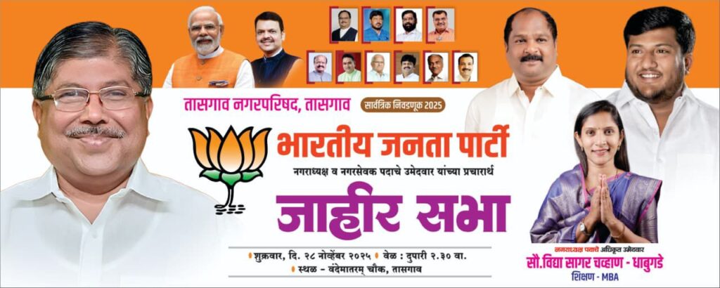 तासगाव, गुरुवार दिनांक – 27 नोव्हेंबर 2025 (महाराष्ट्र मराठी न्यूज वृत्तसेवा) तासगाव नगरपालिकेचा प्रचार शिगेला पोहोचला आहे. सर्वच गटांनी आपली ताकद पणाला लावली आहे. येथील राजकारण फक्त दोन कुटुंबांभोवती फिरत होते. मात्र या निवडणुकीत भाजपचे तालुकाध्यक्ष स्वप्नील पाटील यांच्या नेतृत्वाखाली तिसरा पर्याय शहरवासियांसमोर ठेवला आहे. गेल्या तीन चार दशकात प्रथमच तिसरे पॅनेल तासगावात उभे आहे. या पॅनेलच्या प्रचारासाठी पालकमंत्री चंद्रकांत पाटील उद्या (शुक्रवार) तासगावात येत आहेत. येथील वंदे मातरम चौकात दुपारी अडीच वाजता त्यांची सभा होत आहे. आजपर्यंत तासगावच्या राजकारणात स्व. आर. आर. पाटील व माजी खासदार संजय पाटील हे दोनच गट अस्तित्वात होते. या दोन्ही घराण्यांनी तिसरा पर्यायच तयार होऊ दिला नाही. काहींनी तिसरा पर्याय म्हणून पुढे येण्याचा प्रयत्न केला मात्र लोकांनी त्यांना साथ दिली नाही. त्यामुळे या दोन्ही कुटुंबाभोवतीच येथील राजकारण फिरत राहिले. मात्र भाजपचे तालुकाध्यक्ष स्वप्नील पाटील यांनी पालिका निवडणुकीच्या निमित्ताने तिसरा पर्याय जनतेसमोर ठेवला आहे. पाटील यांनी सर्व घटकांना न्याय देत नगराध्यक्षांसह २५ उमेदवार रिंगणात उतरवले आहेत. आबा काका गटाच्या एकाधिकारशाहीला यानिमित्ताने शह देण्याचा प्रयत्न होणार आहे. पालिका निवडणुकीत भाजपच्या एन्ट्रीमुळे चुरस वाढली आहे. भाजपने विद्या सागर चव्हाण या सुशिक्षीत महिलेला नगराध्यक्षपदाची उमेदवारी दिली आहे. त्यांनी एमबीए पर्यंतचे शिक्षण पूर्ण केले आहे. नवीन पर्याय म्हणून तासगावकर त्यांच्याकडे पाहत आहेत. त्यांच्या रुपाने पालिकेवर कमळ फुलेल, असा विश्वास भाजपचे तालुकाध्यक्ष स्वप्नील पाटील यांनी व्यक्त केला आहे. या निवडणुकीत सर्वसामान्य घरातील, तळागाळातील कार्यकर्त्यांना भाजपने उमेदवारी दिली आहे. त्यामुळे हे उमेदवार यश खेचून आणतील, असा भाजपला विश्वास आहे. भाजपच्या पॅनेलने ‘घर टू घर’ प्रचार सुरू केला आहे. त्यांच्या उमेदवारांना मतदारांचा पाठींबा मिळत आहे. त्यामुळे या उमेदवारांना ताकद देण्यासाठी पालकमंत्री पाटील उद्या मैदानात उतरत आहेत. त्यांची येथील वंदे मातरम चौकात सभा होत आहे. सभेला तासगावकरांनी मोठ्या संख्येने उपस्थित रहावे, असे आवाहन स्वप्नील पाटील यांनी केले आहे.